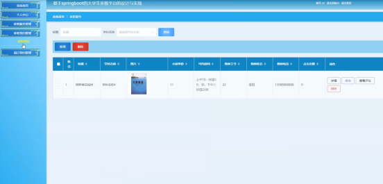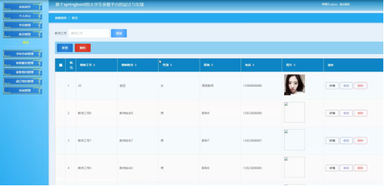 管理员点击教员管理。在教员页面输入教师工号进行查询、修改或删除教员列表,并根据需要对教员详情信息进行详情、修改或删除操作。如图5-9所示: