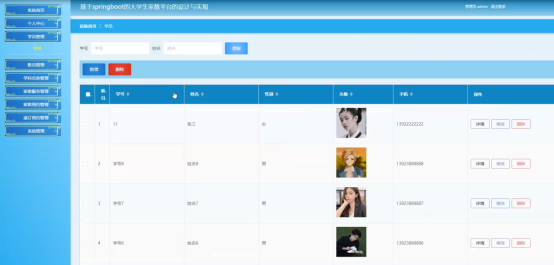 管理员点击学员管理。在学员页面输入学号和姓名进行查询、新增或删除学员列表,并根据要求对学员详情信息进行详情、修改或删除运行;如图5-8所示: