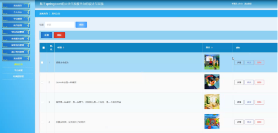 管理员点击系统管理。在通知公告页面输入标题可以查询、新增或删除通知公告列表,并根据需要对通知公告详情信息进行详情、修改或删除操作;还允许对平台服务和轮播图管理进行操作。如图5-12所示: