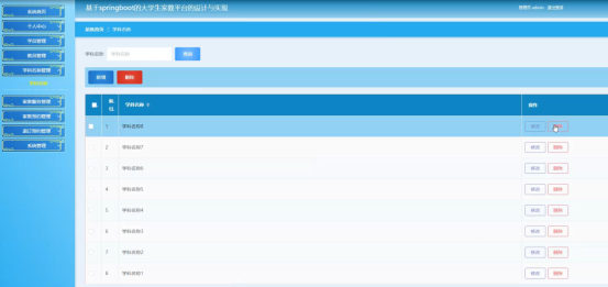 管理员点击学科名称管理。在学科名称页面输入学科名称进行查询、新增或删除学科名称列表,并根据需要对学科名称详情信息进行修改或删除操作。如图5-10所示: