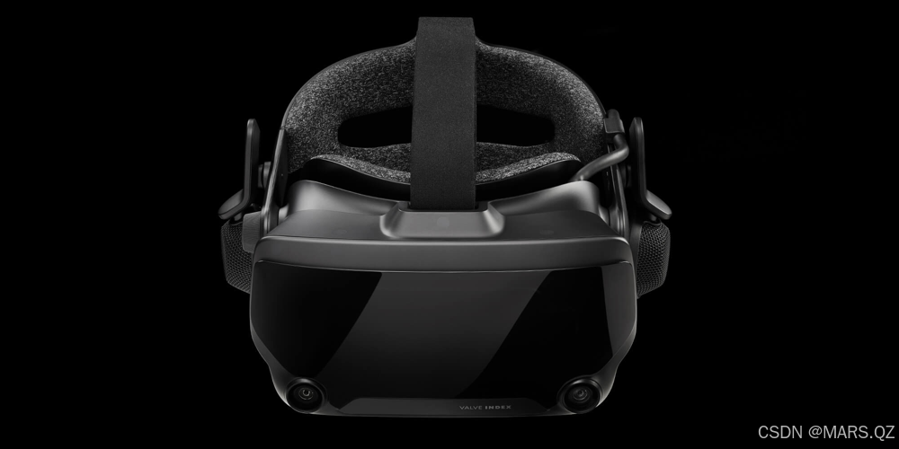 Valve Index头戴式显示设备正面,可见其光滑的外壳以及底部两侧的前置摄像头。该设备在硬件上追求高保真视觉和音频体验,并提供多方面的可调节设计。