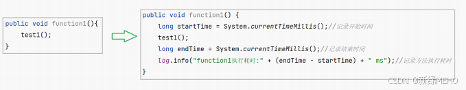 如何统计呢? 可以在业务⽅法运⾏前和运⾏后, 记录下⽅法的开始时间和结束时间, 两者之差就是这个⽅法的耗时。