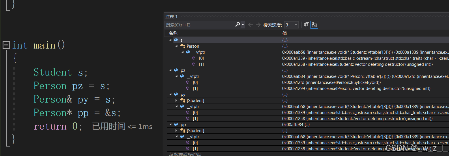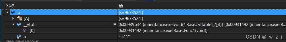 发现有一个_vfptr,大小为4个字节,再加上内存对齐,所以大小为8,这里也引出了关于多态的原理。接下来看一下写了继承类后,继承类中对象的内存分布是什么样的: