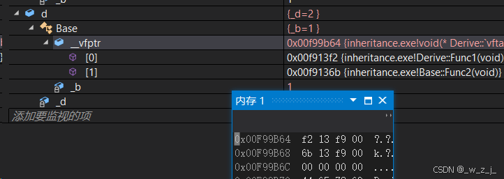 发现,派生类对象d中也有一个虚表指针,d对象由两部分构成,一部分是父类继承下来的成员,虚 表指针也存在于这一部分,另一部分是自己的成员。基类b对象和派生类d对象虚表是不一样的,Func1完成了重写,所以d的虚表中存的是重写的Derive::Func1。重写是语法的叫法,覆盖是原理层的叫法。另外Func2继承下来后是虚函数,所以放进了虚表,Func3也继承下来了,但是不是虚函 数,所以不会放进虚表。虚函数表本质是一个存虚函数指针的指针数组,一般情况这个数组最后面放了一个nullptr。可以在内存中观察一下: