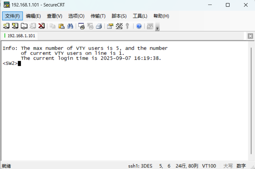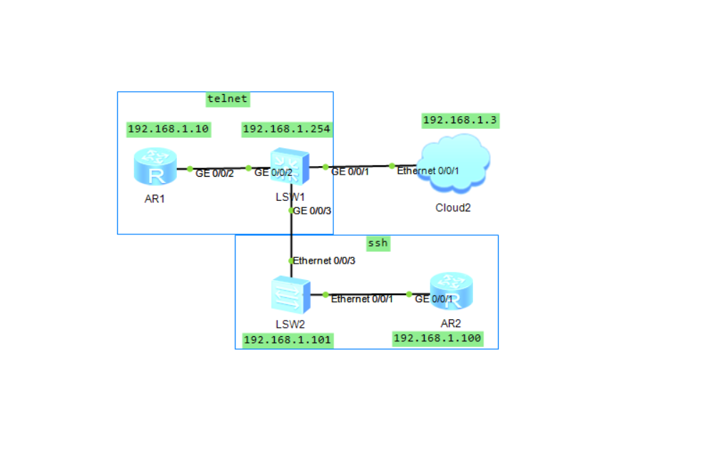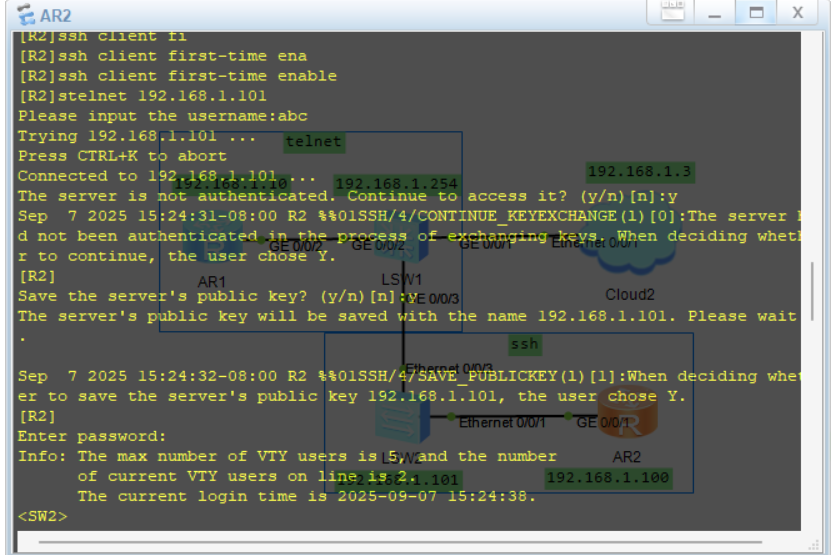 2、拓扑内两台路由器也可以使用(telnet、ssh)分别登录两台交换机
