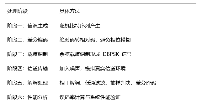 本研究借助信源生成、差分编码、载波调制、信道传输、解调处理及性能分析等阶段,完成了基于DBPSK的通信系统设计与达成。