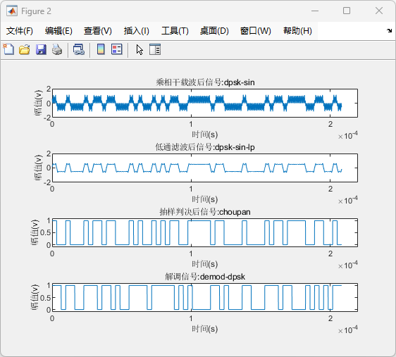 低通滤波后信号 dpsk-sin-lp:去除高频分量,保留基带信号。