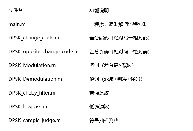 本系统基于 MATLAB 平台,面向数字通信实验设计,主要实现 DBPSK 调制解调功能。系统由 信号生成模块、差分编码模块、载波调制模块、加噪模块、解调模块、误码率分析模块和波形可视化模块 构成。