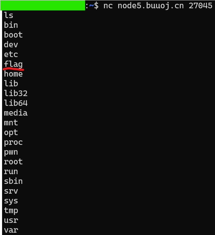 3.链接靶机,获取flag:由于此题非常简单,直接提供了获取 shell 的途径,可不使用python脚本进行攻击链接,直接启用nc命令(netcat)即可——nc <靶机IP> <端口号>;链接成功后,使用ls命令显示目录中的文件和子目录,寻找flag文件;
