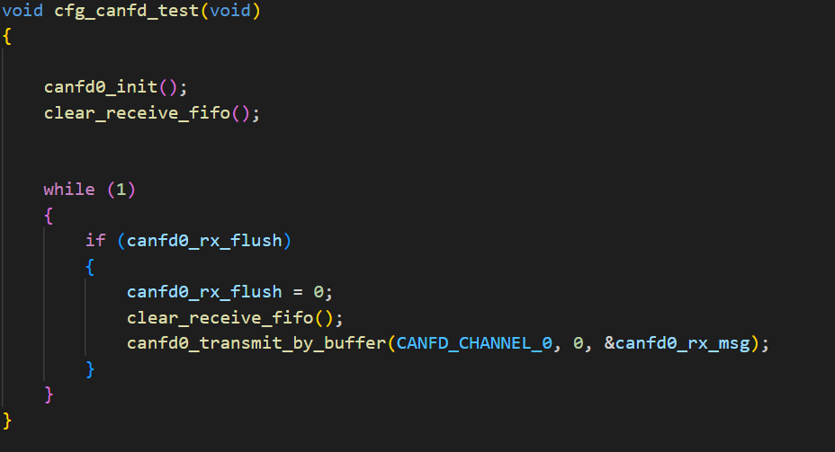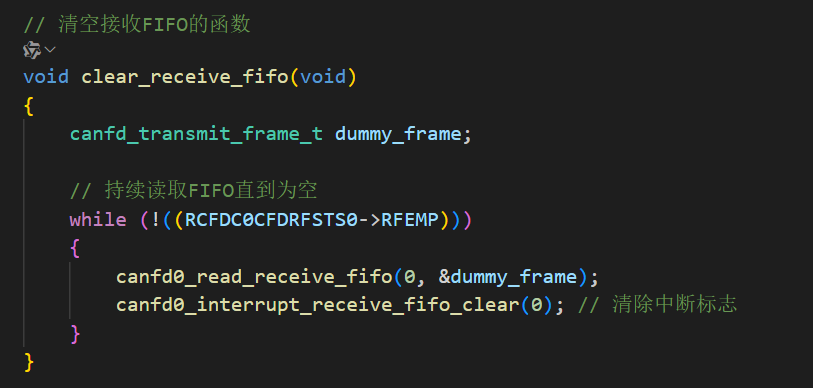 若将 cfg_canfd_test 函数中的 clear_receive_fifo调⽤注释掉