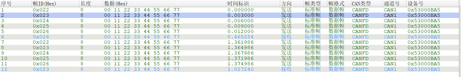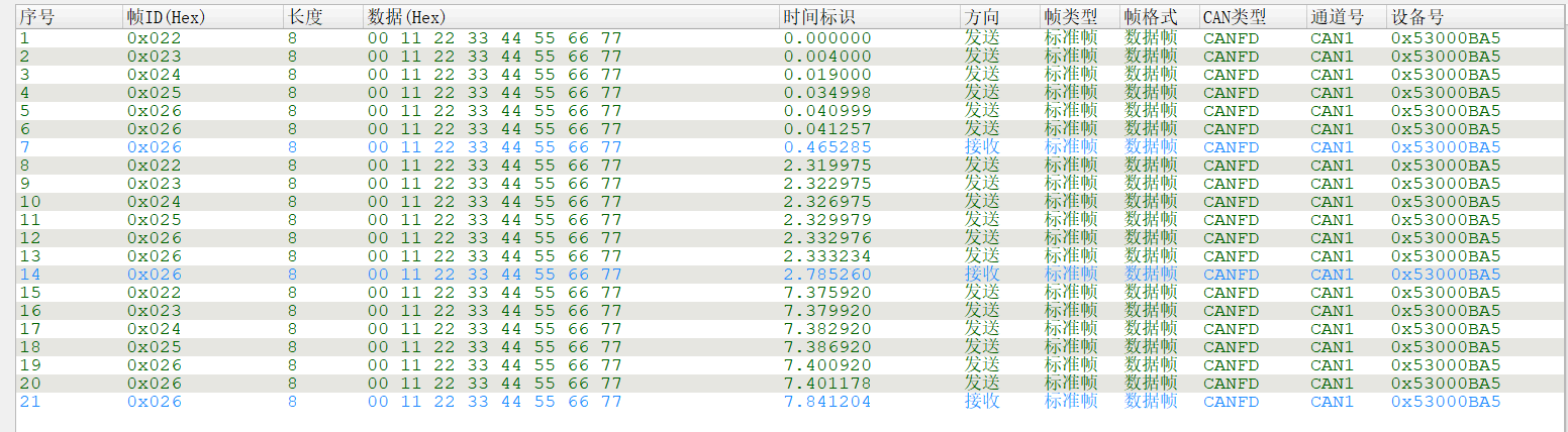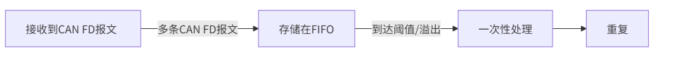 每个 FIFO 单元存储⼀帧完整的 CAN FD 报⽂,包含:ID、DLC、数据载荷、时间戳、帧类型(CAN/FD)、BRS、ESI 等关键字段,确保报⽂结构完整。