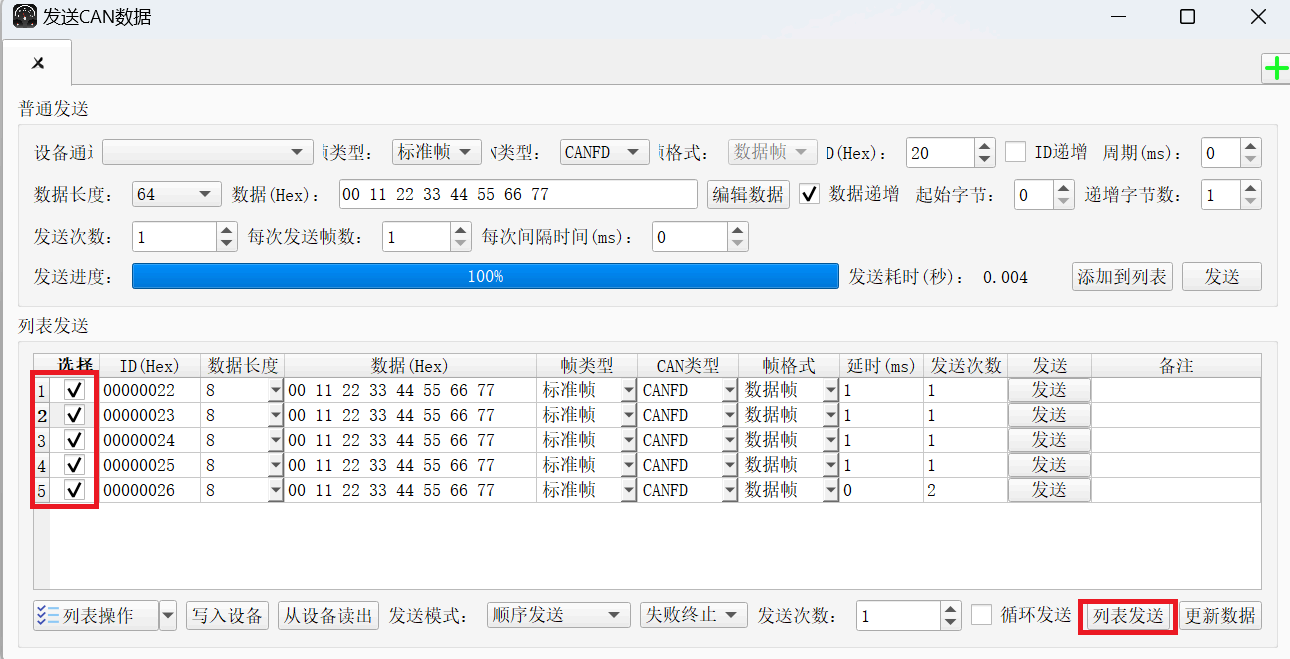 2. 选择列表发送模式,发送 ID 为 22, 23, 24, 25, 26 的报⽂;