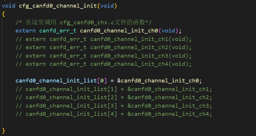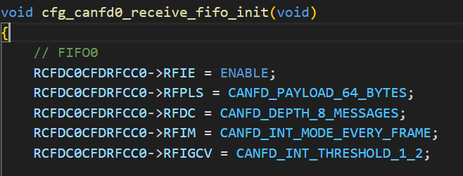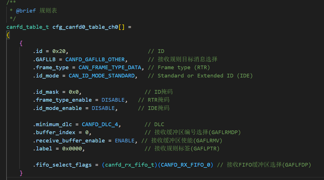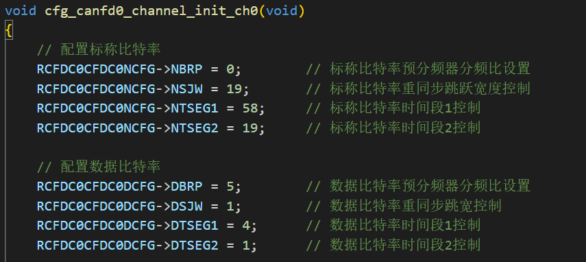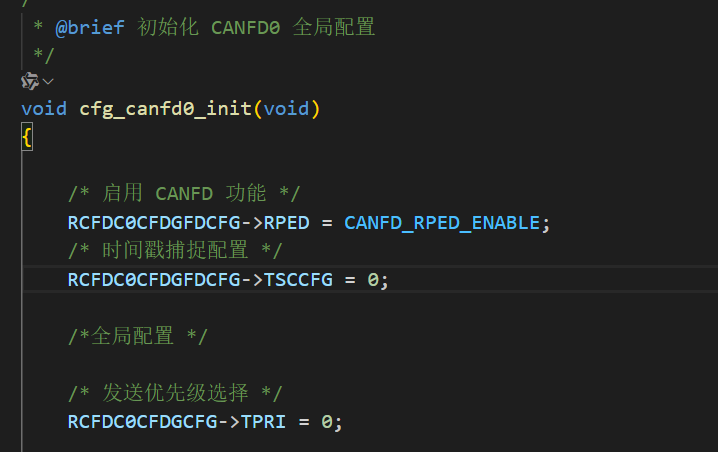 在 cfg_canfd0_init 函数中进⾏全局配置,这边选择默认配置