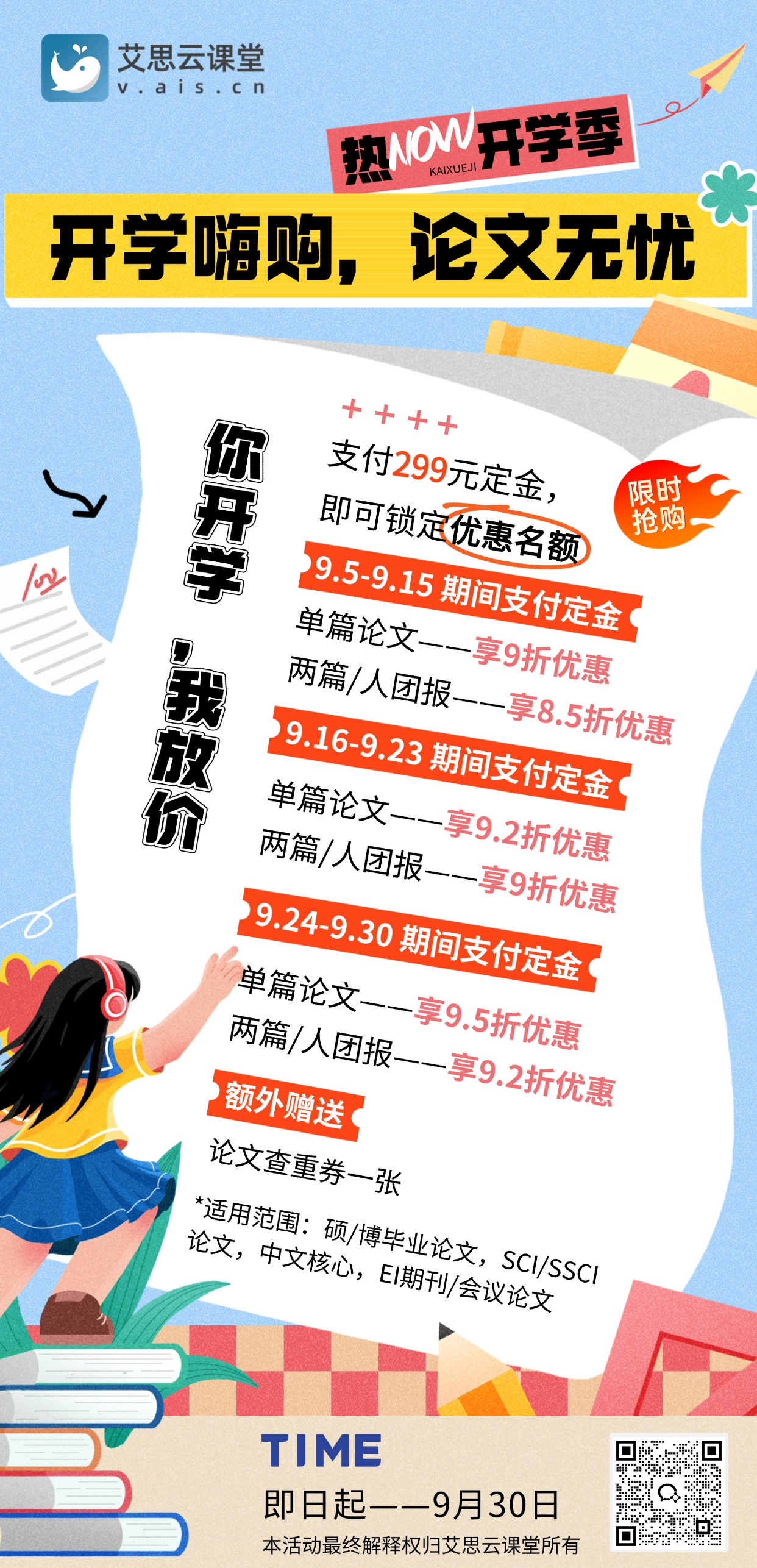 为此,艾思云课堂诚意推出【开学嗨购·论文无忧】优惠活动,为你精准匹配同专业名校导师,提供一对一深度指导,全方位攻克论文难题!