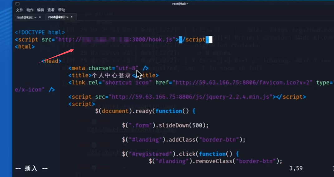 确认目标框之后 将beef里的恶意语句插入 要将127 换为主机ip