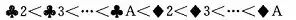 方法2:先按13 个面值给出13 个编号组(2 号。3 号,...,A 号)。将牌按面值依次放入相应的编号组,分成13 堆。