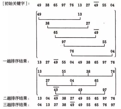 即:先将要排序的一组记录按某个增量d(n/2,n为要排序数的个数)分成若干组子序列,每组中记录的下标相差d.对每组中所有元素进行直接插入排序,然后再用一个较小的增量(d/2)对它进行分组,在每组中再进行直接插入排序。继续不断缩小增量直至为1,最后使用直接插入排序完毕排序。