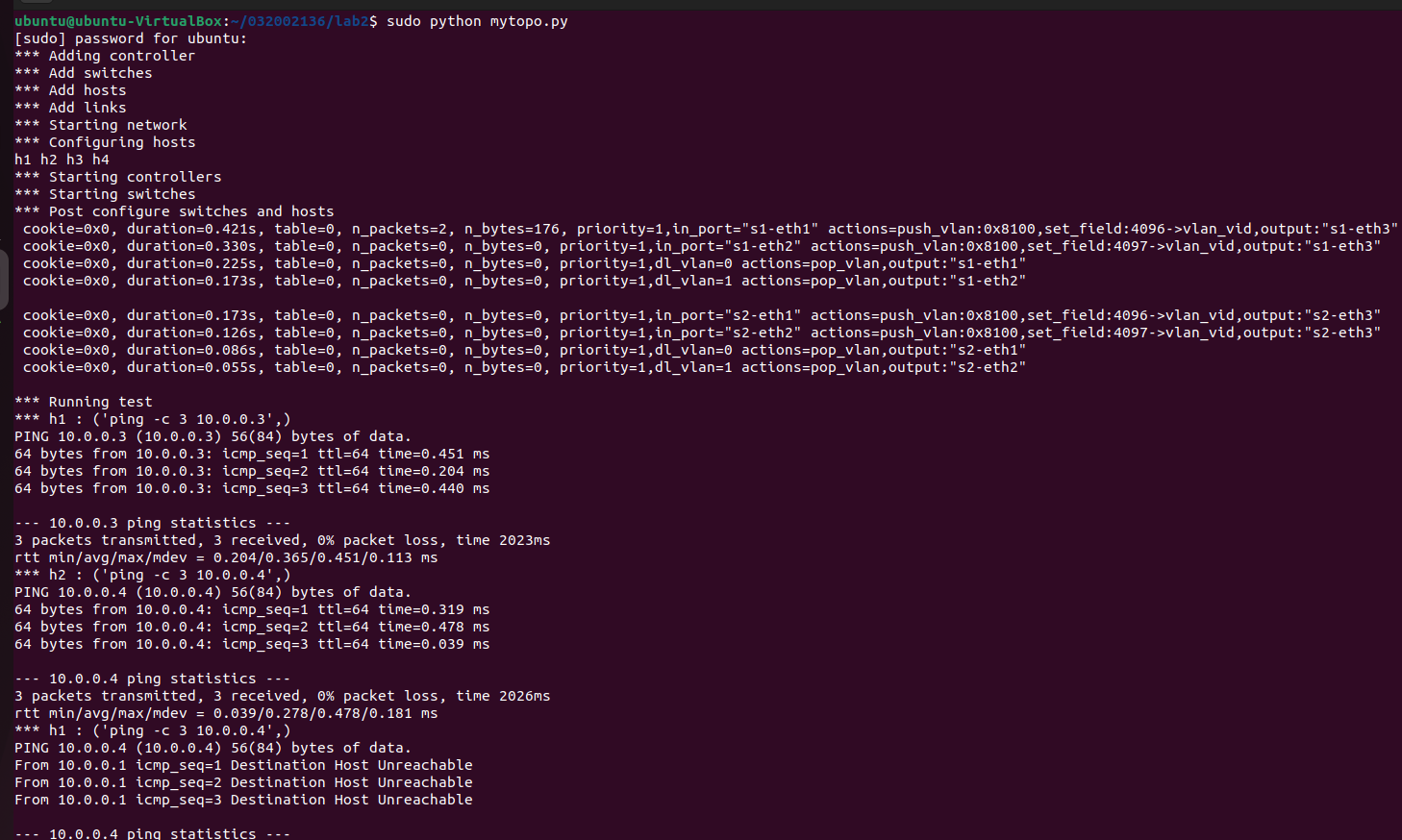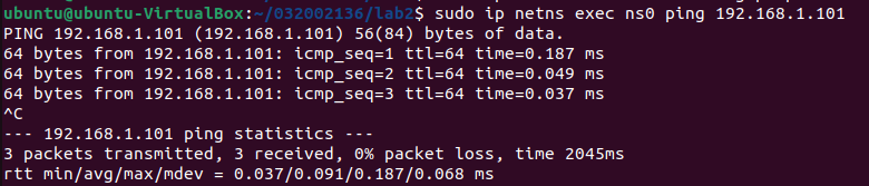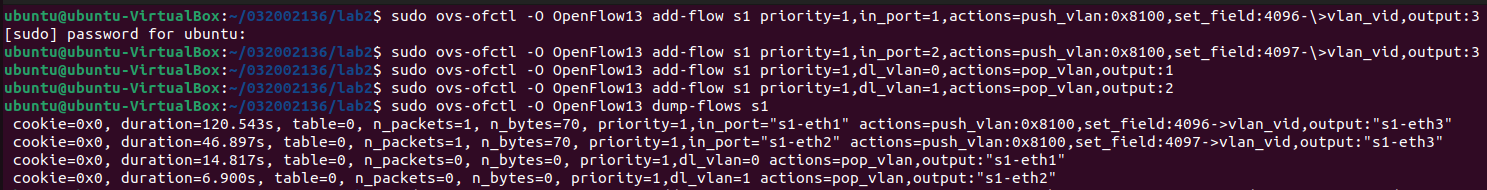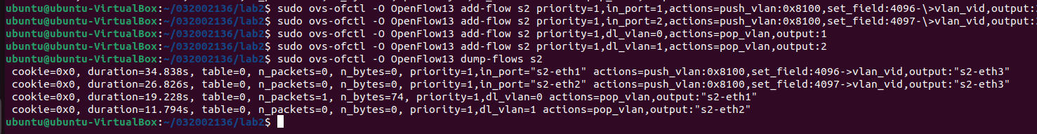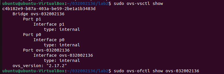 - /home/用户名/学号/lab2/目录下执行ovs-vsctl show命令、以及p0和p1连通性测试的执行结果截图;
