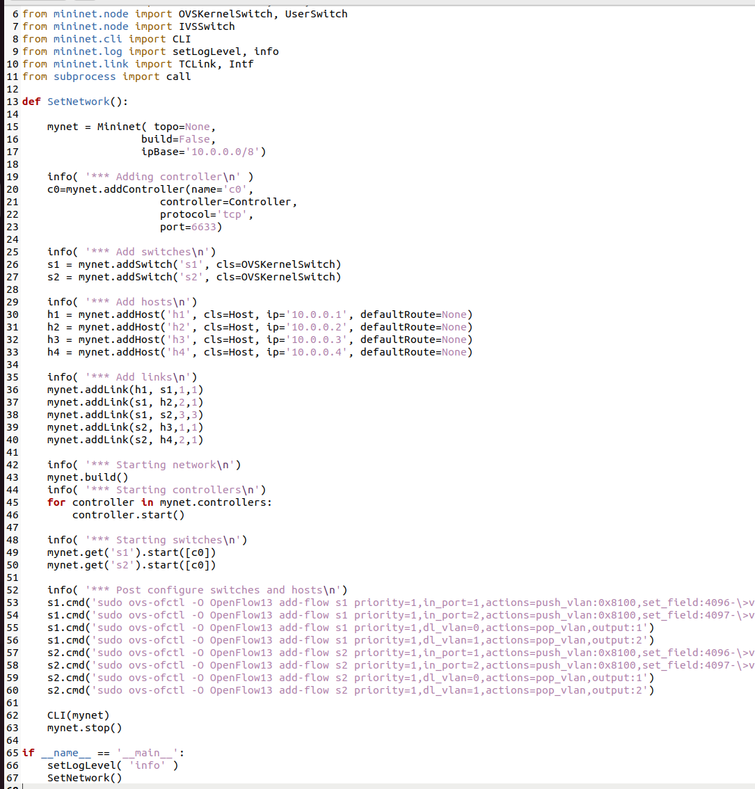 - 在实现topo时候,python代码中的mininet写成了miniedit导致出现no module named 'miniedit'。