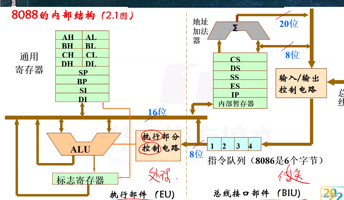 8088、8086的功能部件 EU和BIU 寄存器 14个16位寄存器