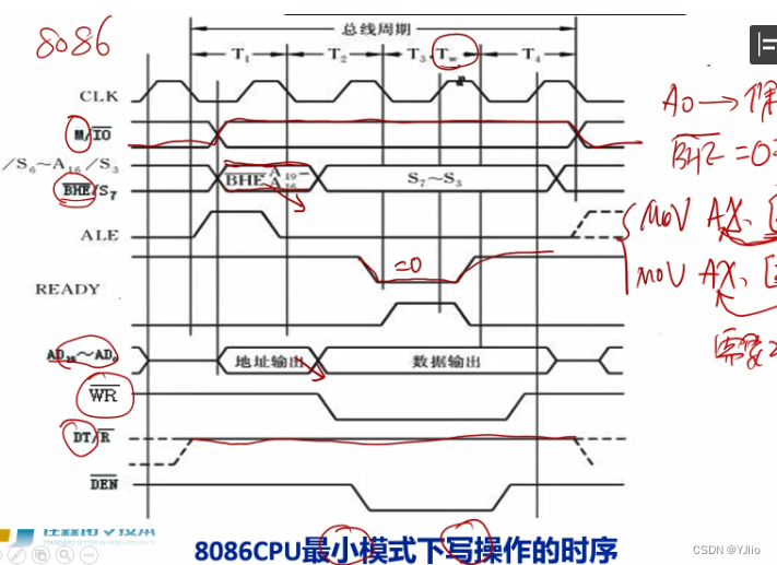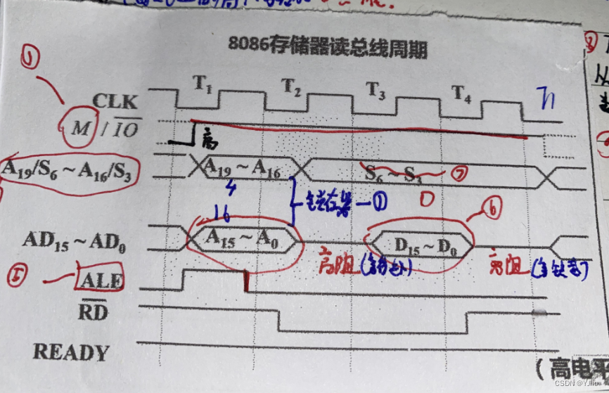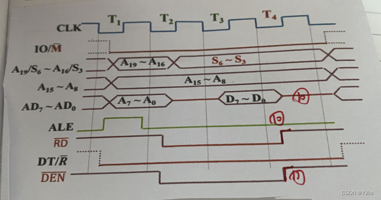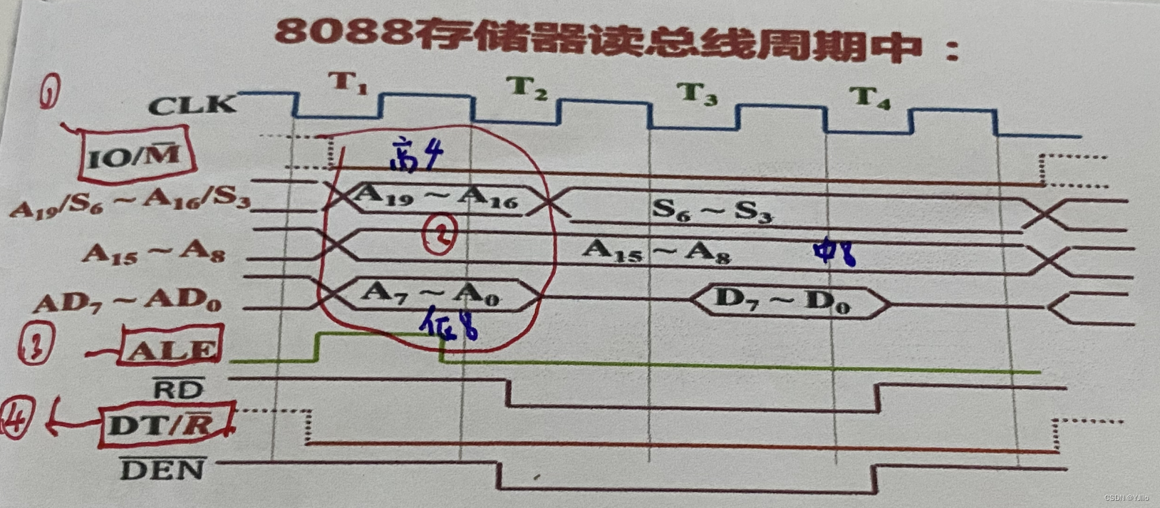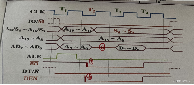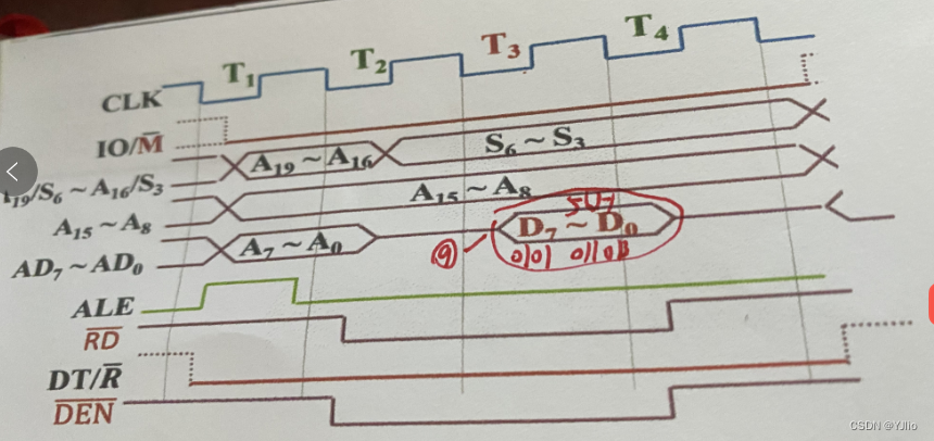 A0到A19 20根地址线 :在T1 200ns 时期 ③ 传送的是地址信号(A0~A15)④ 在访问I/O时 高4位 的地址线无效