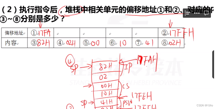 入栈 把0241H压栈了 当前桟顶的指针已经移动到了41H,压栈上面是低地址,下面是高地址,每当压入一个字数据,SP-2