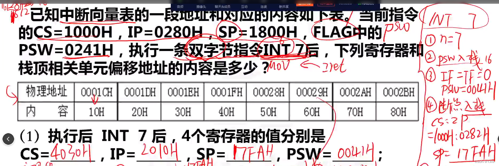 要找到下一条指令的CS:IP的值,因为他的段同INT 7一样 所以起始地址不变1000H