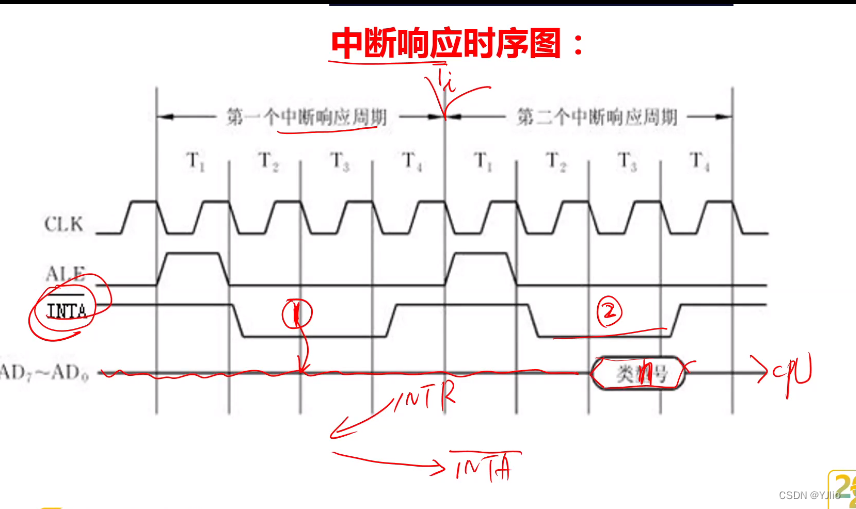 ①取中断类型号n:启动中断响应总线(INTA)操作,在第2个中断响应总线周期读取中断类型号n。