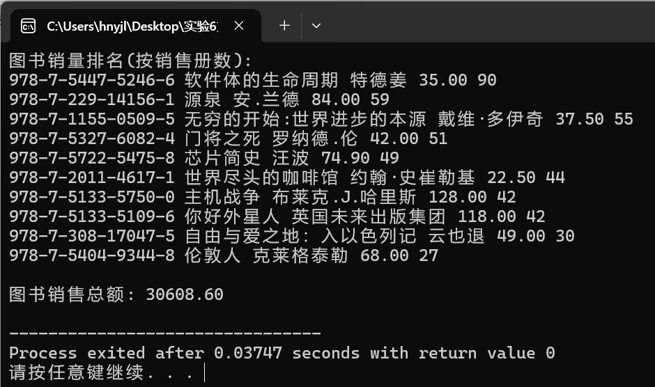 1 #include <stdio.h> 2 #define N 10 3 4 typedef struct { 5 char isbn[20]; // isbn号 6 char name[80]; // 书名 7 char author[80]; // 作者 8 double sales_price; // 售价 9 int sales_count; // 销售册数 10 } Book; 11 12 void output(Book x[], int n); 13 void sort(Book x[], int n); 14 double sales_amount(Book x[], int n); 15 16 int main() { 17 Book x[N] = {{"978-7-5327-6082-4", "门将之死", "罗纳德.伦", 42, 51}, 18 {"978-7-308-17047-5", "自由与爱之地:入以色列记", "云也退", 49 , 30}, 19 {"978-7-5404-9344-8", "伦敦人", "克莱格泰勒", 68, 27}, 20 {"978-7-5447-5246-6", "软件体的生命周期", "特德姜", 35, 90}, 21 {"978-7-5722-5475-8", "芯片简史", "汪波", 74.9, 49}, 22 {"978-7-5133-5750-0", "主机战争", "布莱克.J.哈里斯", 128, 42}, 23 {"978-7-2011-4617-1", "世界尽头的咖啡馆", "约翰·史崔勒基", 22.5, 44}, 24 {"978-7-5133-5109-6", "你好外星人", "英国未来出版集团", 118, 42}, 25 {"978-7-1155-0509-5", "无穷的开始:世界进步的本源", "戴维·多伊奇", 37.5, 55}, 26 {"978-7-229-14156-1", "源泉", "安.兰德", 84, 59}}; 27 28 printf("图书销量排名(按销售册数): \n"); 29 sort(x, N); 30 output(x, N); 31 32 printf("\n图书销售总额: %.2f\n", sales_amount(x, N)); 33 34 return 0; 35 } 36 37 void output(Book x[], int n){ 38 for(int i=0;i<n;i++){ 39 printf("%s %s %s %.2f %d\n",x[i].isbn,x[i].name,x[i].author,x[i].sales_price,x[i].sales_count); 40 } 41 } 42 43 void sort(Book x[],int n){ 44 for (int i=0;i<n-1;i++){ 45 for(int j=0;j<n-i-1;j++){ 46 if(x[j].sales_count<x[j+1].sales_count){ 47 Book temp=x[j]; 48 x[j]=x[j+1]; 49 x[j+1]=temp; 50 } 51 } 52 } 53 } 54 55 double sales_amount(Book x[],int n){ 56 double total =0; 57 for(int i=0;i<n;i++){ 58 total +=x[i].sales_price*x[i].sales_count; 59 } 60 return total; 61 }