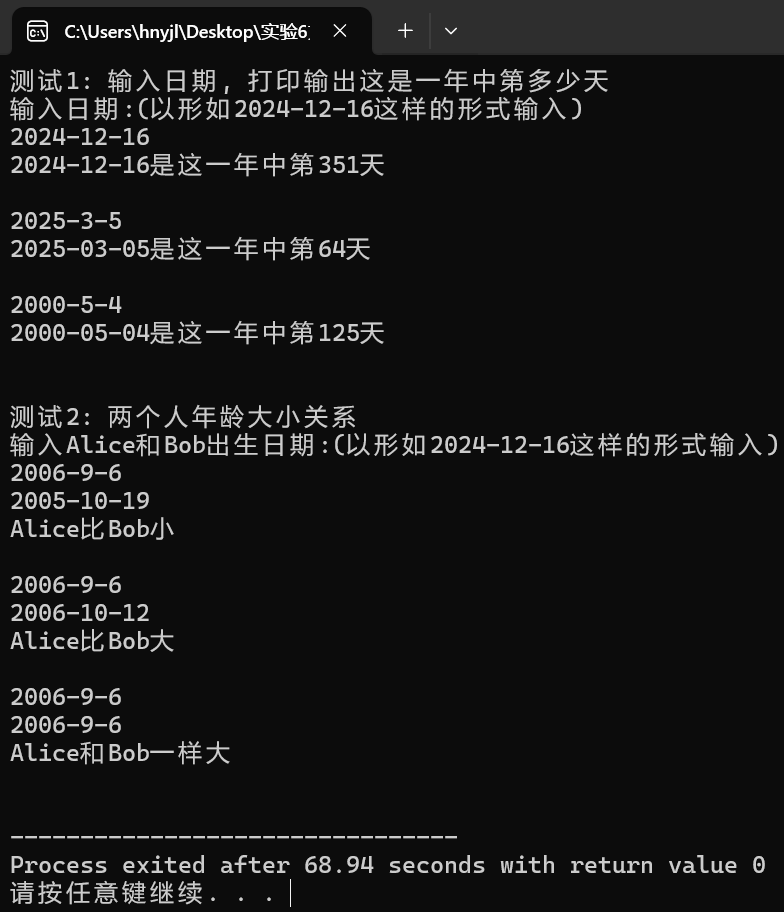 1 #include <stdio.h> 2 3 typedef struct { 4 int year; 5 int month; 6 int day; 7 } Date; 8 9 // 函数声明 10 void input(Date *pd); // 输入日期给pd指向的Date变量 11 int day_of_year(Date d); // 返回日期d是这一年的第多少天 12 int compare_dates(Date d1, Date d2); // 比较两个日期: 13 // 如果d1在d2之前,返回-1; 14 // 如果d1在d2之后,返回1 15 // 如果d1和d2相同,返回0 16 17 void test1() { 18 Date d; 19 int i; 20 21 printf("输入日期:(以形如2024-12-16这样的形式输入)\n"); 22 for(i = 0; i < 3; ++i) { 23 input(&d); 24 printf("%d-%02d-%02d是这一年中第%d天\n\n", d.year, d.month, d.day, day_of_year(d)); 25 } 26 } 27 28 void test2() { 29 Date Alice_birth, Bob_birth; 30 int i; 31 int ans; 32 33 printf("输入Alice和Bob出生日期:(以形如2024-12-16这样的形式输入)\n"); 34 for(i = 0; i < 3; ++i) { 35 input(&Alice_birth); 36 input(&Bob_birth); 37 ans = compare_dates(Alice_birth, Bob_birth); 38 39 if(ans == 0) 40 printf("Alice和Bob一样大\n\n"); 41 else if(ans == -1) 42 printf("Alice比Bob大\n\n"); 43 else 44 printf("Alice比Bob小\n\n"); 45 } 46 } 47 48 int main() { 49 printf("测试1: 输入日期, 打印输出这是一年中第多少天\n"); 50 test1(); 51 52 printf("\n测试2: 两个人年龄大小关系\n"); 53 test2(); 54 } 55 56 // 补足函数input实现 57 // 功能: 输入日期给pd指向的Date变量 58 void input(Date *pd) { 59 scanf("%d-%d-%d", &pd->year, &pd->month, &pd->day); 60 } 61 62 // 补足函数day_of_year实现 63 // 功能:返回日期d是这一年的第多少天 64 int day_of_year(Date d) { 65 int days[]={0,31,28,31,30,31,30,31,31,30,31,30,31}; 66 int day0fYear=0; 67 if(d.year%4==0&&(d.year%100!=0||d.year%400==0)){ 68 days[2]=29; 69 } 70 71 for(int i=1;i<d.month;i++){ 72 day0fYear+=days[i]; 73 } 74 day0fYear+=d.day; 75 76 return day0fYear; 77 } 78 79 // 补足函数compare_dates实现 80 // 功能:比较两个日期: 81 // 如果d1在d2之前,返回-1; 82 // 如果d1在d2之后,返回1 83 // 如果d1和d2相同,返回0 84 int compare_dates(Date d1, Date d2) { 85 if(d1.year<d2.year)return -1; 86 if(d1.year>d2.year)return 1; 87 88 if(d1.month<d2.month)return -1; 89 if(d1.month>d2.month)return 1; 90 91 if(d1.day<d2.day)return -1; 92 if(d1.day>d2.day)return 1; 93 94 return 0; 95 }