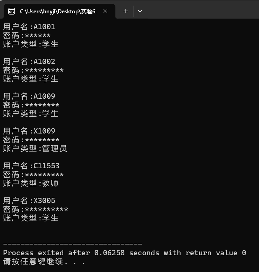 1 #include <stdio.h> 2 #include <string.h> 3 4 enum Role {admin, student, teacher}; 5 6 typedef struct { 7 char username[20]; // 用户名 8 char password[20]; // 密码 9 enum Role type; // 账户类型 10 } Account; 11 12 13 // 函数声明 14 void output(Account x[], int n); // 输出账户数组x中n个账户信息,其中,密码用*替代显示 15 16 int main() { 17 Account x[] = {{"A1001", "123456", student}, 18 {"A1002", "123abcdef", student}, 19 {"A1009", "xyz12121", student}, 20 {"X1009", "9213071x", admin}, 21 {"C11553", "129dfg32k", teacher}, 22 {"X3005", "921kfmg917", student}}; 23 int n; 24 n = sizeof(x)/sizeof(Account); 25 output(x, n); 26 27 return 0; 28 } 29 30 // 待补足的函数output()实现 31 // 功能:遍历输出账户数组x中n个账户信息 32 // 显示时,密码字段以与原密码相同字段长度的*替代显示 33 void output(Account x[], int n) { 34 for (int i=0;i<n;i++){ 35 printf("用户名:%s\n",x[i].username); 36 printf("密码:"); 37 for (int j=0;j<strlen(x[i].password);j++){ 38 printf("*"); 39 } 40 printf("\n"); 41 printf("账户类型:"); 42 switch(x[i].type){ 43 case admin: 44 printf("管理员\n"); 45 break; 46 case student: 47 printf("学生\n"); 48 break; 49 case teacher: 50 printf("教师\n"); 51 break; 52 } 53 printf("\n"); 54 } 55 }