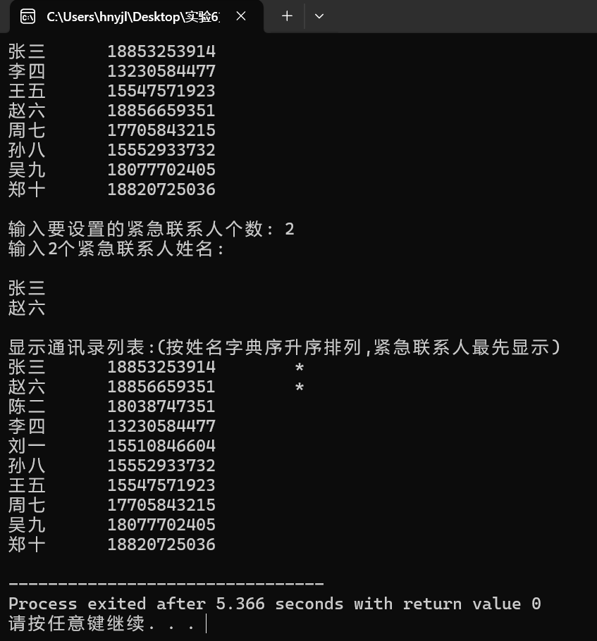 1 #include <stdio.h> 2 #include <string.h> 3 4 typedef struct { 5 char name[20]; // 姓名 6 char phone[12]; // 手机号 7 int vip; // 是否为紧急联系人,是取1;否则取0 8 } Contact; 9 10 11 // 函数声明 12 void set_vip_contact(Contact x[], int n, char name[]); // 设置紧急联系人 13 void output(Contact x[], int n); // 输出x中联系人信息 14 void display(Contact x[], int n); // 按联系人姓名字典序升序显示信息,紧急联系人最先显示 15 16 17 #define N 10 18 int main() { 19 Contact list[N] = {{"刘一", "15510846604", 0}, 20 {"陈二", "18038747351", 0}, 21 {"张三", "18853253914", 0}, 22 {"李四", "13230584477", 0}, 23 {"王五", "15547571923", 0}, 24 {"赵六", "18856659351", 0}, 25 {"周七", "17705843215", 0}, 26 {"孙八", "15552933732", 0}, 27 {"吴九", "18077702405", 0}, 28 {"郑十", "18820725036", 0}}; 29 int vip_cnt, i; 30 char name[20]; 31 32 printf("显示原始通讯录信息: \n"); 33 output(list, N); 34 35 printf("\n输入要设置的紧急联系人个数: "); 36 scanf("%d", &vip_cnt); 37 38 printf("输入%d个紧急联系人姓名:\n", vip_cnt); 39 for(i = 0; i < vip_cnt; ++i) { 40 scanf("%s", name); 41 set_vip_contact(list, N, name); 42 } 43 44 printf("\n显示通讯录列表:(按姓名字典序升序排列,紧急联系人最先显示)\n"); 45 display(list, N); 46 47 return 0; 48 } 49 50 // 补足函数set_vip_contact实现 51 // 功能:将联系人数组x中,联系人姓名与name一样的人,设置为紧急联系人(即成员vip值设为1) 52 void set_vip_contact(Contact x[], int n, char name[]) { 53 for(int i=0;i<n;i++){ 54 if(strcmp(x[i].name,name)==0){ 55 x[i].vip=1; 56 break; 57 } 58 } 59 } 60 61 // 补足函数display实现 62 // 功能: 显示联系人数组x中的联系人信息 63 // 按姓名字典序升序显示, 紧急联系人显示在最前面 64 void display(Contact x[], int n) { 65 Contact vip[10],fvip[10]; 66 int vipcount=0,fvipcount=0; 67 int i,j; 68 69 for(i = 0;i < n;i++){ 70 if(x[i].vip) 71 vip[vipcount++]=x[i]; 72 else 73 fvip[fvipcount++]=x[i]; 74 } 75 76 Contact y[20]; 77 int ycount=0; 78 79 for(i = 0;i < vipcount;i++) 80 y[ycount++]=vip[i]; 81 for(i = 0;i < fvipcount;i++) 82 y[ycount++]=fvip[i]; 83 84 Contact t; 85 86 for(i = 0;i < vipcount-1;i++) 87 for(j = 0;j < vipcount-1-i;j++) 88 if(strcmp(y[j].name,y[j+1].name)>0){ 89 t=y[j]; 90 y[j]=y[j+1]; 91 y[j+1]=t; 92 } 93 for(i = vipcount;i < ycount-1;i++) 94 for(j = vipcount;j < ycount-1-i;j++) 95 if(strcmp(y[j].name,y[j+1].name)>0){ 96 t=y[j]; 97 y[j]=y[j+1]; 98 y[j+1]=t; 99 } 100 101 for(i = 0;i < ycount;i++){ 102 printf("%-10s%-15s",y[i].name,y[i].phone); 103 if(y[i].vip) 104 printf("%5s","*"); 105 printf("\n"); 106 } 107 } 108 109 void output(Contact x[],int n){ 110 int i; 111 112 for(i = 0;i < n;++i){ 113 printf("%-10s%-15s",x[i].name,x[i].phone); 114 if(x[i].vip) 115 printf("%5s","*"); 116 printf("\n"); 117 } 118 }