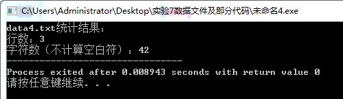 1 #include<stdio.h> 2 3 void read_h(); 4 void read_z(); 5 6 int main(){ 7 printf("data4.txt统计结果:\n"); 8 printf("行数:"); 9 read_h(); 10 printf("字符数(不计算空白符):"); 11 read_z(); 12 return 0; 13 } 14 15 16 17 void read_h(){ 18 FILE *fp; 19 int t=0; 20 char ch; 21 22 fp=fopen("data4.txt","r"); 23 if(!fp) { 24 printf("fail to open file to read\n"); 25 return; 26 } 27 while(!feof(fp)) { 28 ch = fgetc(fp); 29 if(ch =='\n'||ch==EOF) 30 t++; 31 } 32 printf("%d\n",t); 33 fclose(fp); 34 } 35 36 void read_z(){ 37 FILE *fp; 38 int t=0; 39 char ch; 40 41 fp=fopen("data4.txt","r"); 42 if(!fp) { 43 printf("fail to open file to read\n"); 44 return; 45 } 46 while(!feof(fp)) { 47 ch = fgetc(fp); 48 if(ch != '\n'&&ch!=' '&&ch!=' '&&ch!=EOF) 49 t++; 50 } 51 printf("%d",t); 52 fclose(fp); 53 }