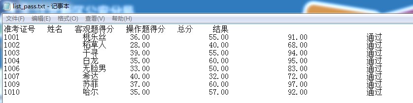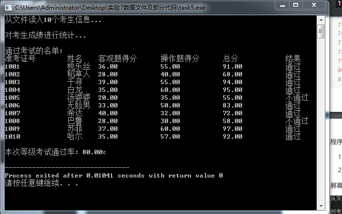 1 ocess(stu, N, stu_pass); 2 3 printf("\n通过考试的名单:\n"); 4 output(stu, N); // 输出所有考生完整信息到屏幕 5 write(stu, N); // 输出考试通过的考生信息到文件 6 7 pass_rate = 1.0 * cnt / N; 8 printf("\n本次等级考试通过率: %.2f%%\n", pass_rate*100); 9 10 return 0; 11 } 12 13 // 把所有考生完整信息输出到屏幕上 14 // 准考证号,姓名,客观题得分,操作题得分,总分,结果 15 void output(STU st[], int n) { 16 int i; 17 18 printf("准考证号\t姓名\t客观题得分\t操作题得分\t总分\t\t结果\n"); 19 for (i = 0; i < n; i++) 20 printf("%ld\t\t%s\t%.2f\t\t%.2f\t\t%.2f\t\t%s\n", st[i].id, st[i].name, st[i].objective, st[i].subjective, st[i].sum, st[i].result); 21 } 22 23 // 从文本文件examinee.txt读入考生信息:准考证号,姓名,客观题得分,操作题得分 24 void read(STU st[], int n) { 25 int i; 26 FILE *fin; 27 28 fin = fopen("examinee.txt", "r"); 29 if (!fin) { 30 printf("fail to open file\n"); 31 return; 32 } 33 34 while (!feof(fin)) { 35 for (i = 0; i < n; i++) 36 fscanf(fin, "%ld %s %f %f", &st[i].id, st[i].name, &st[i].objective, &st[i].subjective); 37 } 38 39 fclose(fin); 40 } 41 42 // 把通过考试的考生完整信息写入文件list_pass.txt 43 // 准考证号,姓名,客观题得分,操作题得分,总分,结果 44 void write(STU s[], int n) { 45 FILE *fp; 46 int i; 47 48 fp=fopen("list_pass.txt","w"); 49 if(!fp) { 50 printf("fail to open file to write\n"); 51 return; 52 } 53 fprintf(fp,"准考证号 姓名 客观题得分 操作题得分 总分 结果\n"); 54 for (i = 0; i < N; i++) 55 if(s[i].sum>=60) 56 fprintf(fp,"%-20ld%-10s\t%-20.2f%-20.2f%-20.2f%s\n", s[i].id, s[i].name, s[i].objective, s[i].subjective, s[i].sum, s[i].result); 57 58 59 fclose(fp); 60 } 61 62 // 对考生信息进行处理:计算每位考生考试总分、结果;统计考试通过的人数 63 int process(STU st[], int n, STU st_pass[]) { 64 int count=0,i; 65 for(i=0;i<n;i++){ 66 st[i].sum=st[i].objective+st[i].subjective; 67 if(st[i].sum>=60){ 68 strcpy(st[i].result,"通过"); 69 st_pass[count++]=st[i]; 70 } 71 else 72 strcpy(st[i].result,"不通过"); 73 } 74 return count; 75 }
