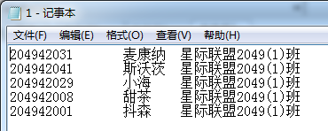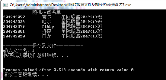 1 #include<stdio.h> 2 #include<stdlib.h> 3 #include<time.h> 4 #define N 80 5 #define M 5 6 typedef struct{ 7 long id; 8 char name[20]; 9 char cname[20]; 10 int sign; 11 }stu; 12 13 void read(stu s[],int n); 14 void choose(stu s[],stu ss[],int n,int m); 15 void save(stu ss[],int m,char fname[]); 16 17 int main(){ 18 stu s[N],ss[M]; 19 int i; 20 char fname[50]; 21 for(i=0;i<N;i++) 22 s[i].sign=0; 23 printf("------------随机抽点名单-----------\n"); 24 read(s,N); 25 choose(s,ss,N,M); 26 for(i=0;i<M;i++) 27 printf("%-16ld%-8s%s\n",ss[i].id,ss[i].name,ss[i].cname); 28 printf("\n------------保存到文件-----------\n"); 29 printf("输入文件名:"); 30 gets(fname); 31 save(ss,M,fname); 32 printf("保存成功"); 33 system("pause"); 34 return 0; 35 } 36 37 void read(stu s[],int n){ 38 FILE *fp; 39 int i; 40 if((fp=fopen("list.txt","r"))==NULL){ 41 printf("fail to open file\n"); 42 return; 43 } 44 for(i=0;i<n;i++) 45 fscanf(fp,"%ld %s %s",&s[i].id,s[i].name,s[i].cname); 46 fclose(fp); 47 } 48 49 void choose(stu s[],stu ss[],int n,int m){ 50 int i,random; 51 srand(time(NULL)); 52 for(i=0;i<m;i++){ 53 do{ 54 random=rand()%80; 55 }while(s[random].sign==1); 56 s[random].sign=1; 57 ss[i]=s[random]; 58 } 59 } 60 61 void save(stu ss[],int m,char fname[]){ 62 FILE *fp; 63 int i; 64 if((fp=fopen(fname,"w"))==NULL){ 65 printf("fail to open file\n"); 66 return; 67 } 68 for(i=0;i<m;i++) 69 fprintf(fp,"%-16ld%-8s%s\n",ss[i].id,ss[i].name,ss[i].cname); 70 fclose(fp); 71 }