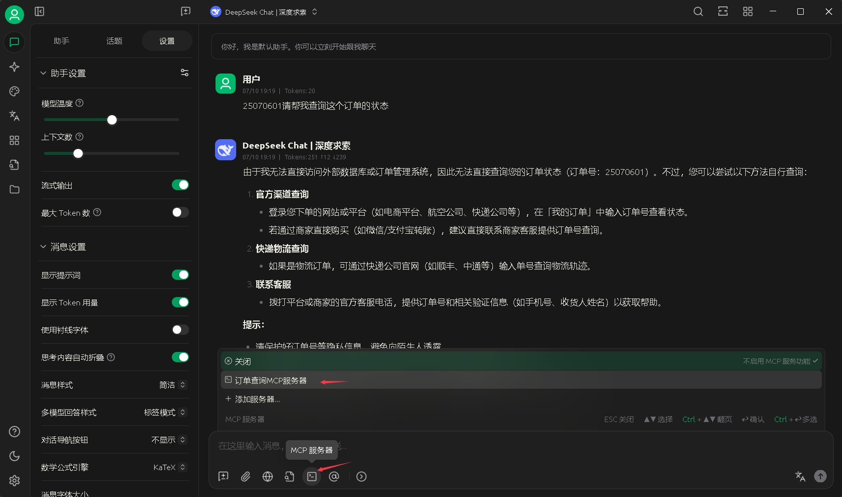 再回到聊天界面,把刚才这个新加的MCP Server启用