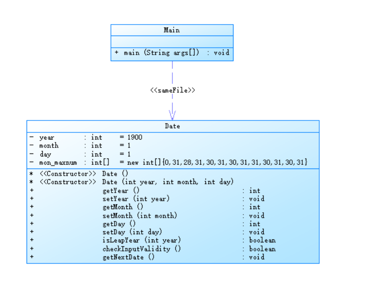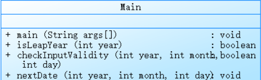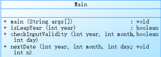 public static void main(String[] args);//主方法 public static boolean isLeapYear(int year) ;//判断year是否为闰年,返回boolean类型 public static boolean checkInputValidity(int year,int month,int day);//判断输入日期是否合法,返回布尔值 public static void nextDate(int year,int month,int day) ; //求输入日期的下一天