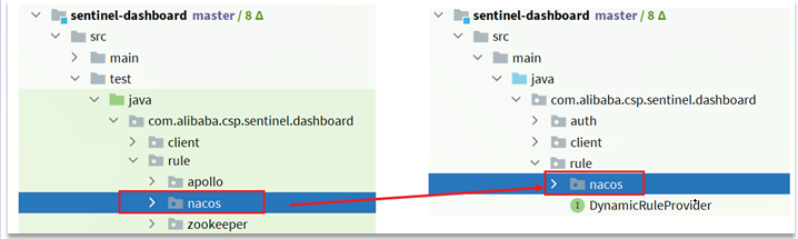 4.添加nacos支持,在sentinel-dashboard的test包下,已经编写了对nacos的支持,我们需要将其拷贝到main下