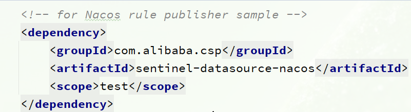 3.修改nacos依赖,在sentinel-dashboard源码的pom文件中,nacos的依赖默认的scope是test,只能在测试时使用,这里要去除