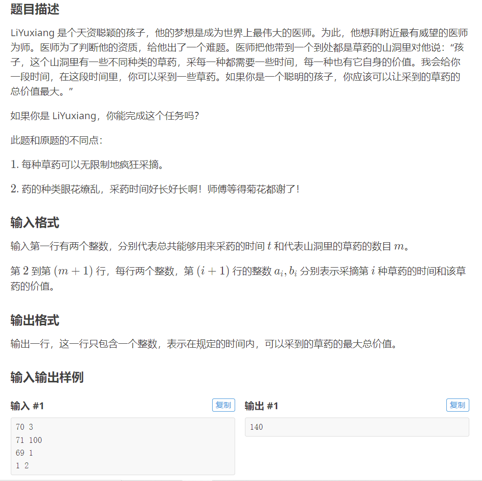 之前我们已经介绍了0/1背包问题,现在我们以洛谷P1616为例,介绍一下完全背包问题