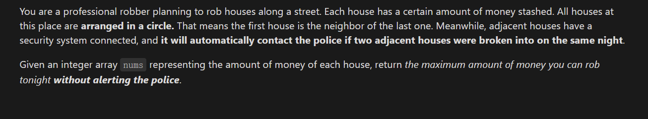 分析:此题与正常打家劫舍问题唯一的区别在于所给数组为环形,即首尾是相接的。首先考虑n>3的情况:由于是环形数组,所以要想获得最大收益首尾元素只能取其一。因此我们只需要用到两个数组来分别dp去掉首元素和去掉尾元素的情况,再取两者中的较大值即可。