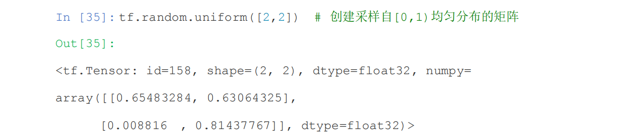 通过 tf.random.uniform(shape, minval=0, maxval=None, dtype=tf.float32)可以创建采样自[minval, maxval)区间的均匀分布的张量。