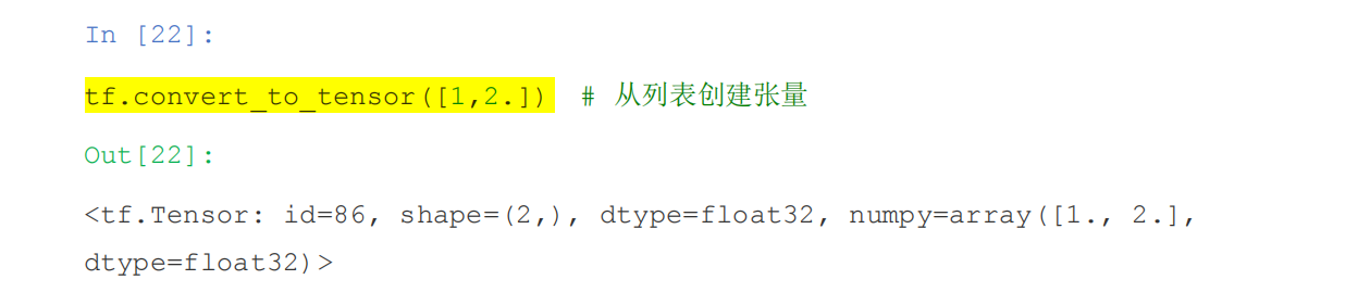 通过 tf.convert_to_tensor 函数可以创建新 Tensor,并将保存在 Python List 对象或者Numpy Array 对象中的数据导入到新 Tensor 中。