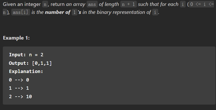 为了计算i的二进制表示中有多少个1,我们如果能找到0≤j<i,使得dp[i]=dp[j]+1,那么我们只需要遍历一遍数组即可求出我们所需要的结果。