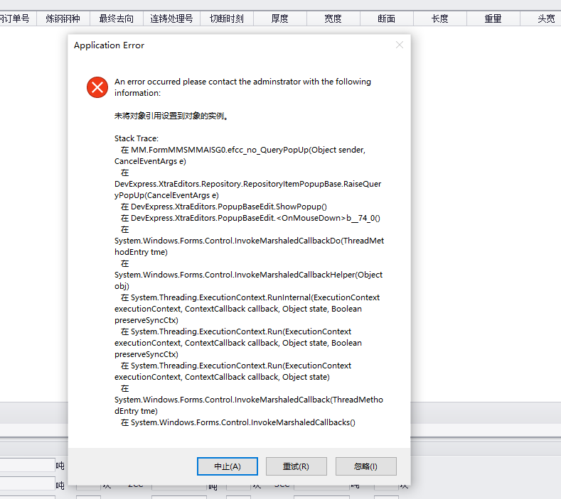 这边做的是一个关联事件,必须先选左边炼钢下拉框,才能获取右边下拉框值,若左边不选,则会报错。y原因是在调用下拉框事件的时候做了一个判断,未选择炼钢区分则提示,但是下拉框值用editValue取的,初始化是没有对象的。改成Text取值就ok了
