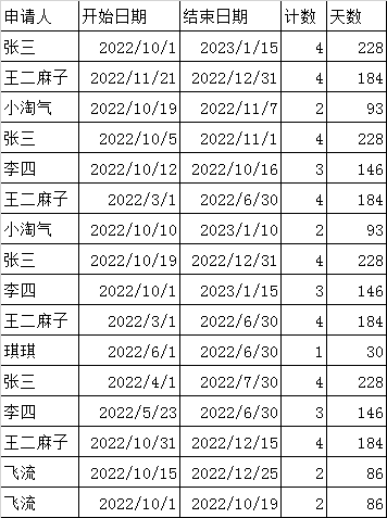 8 '选5列:1条件列,2开始日期,3结束日期,4,第一列出现次数,5累计天数