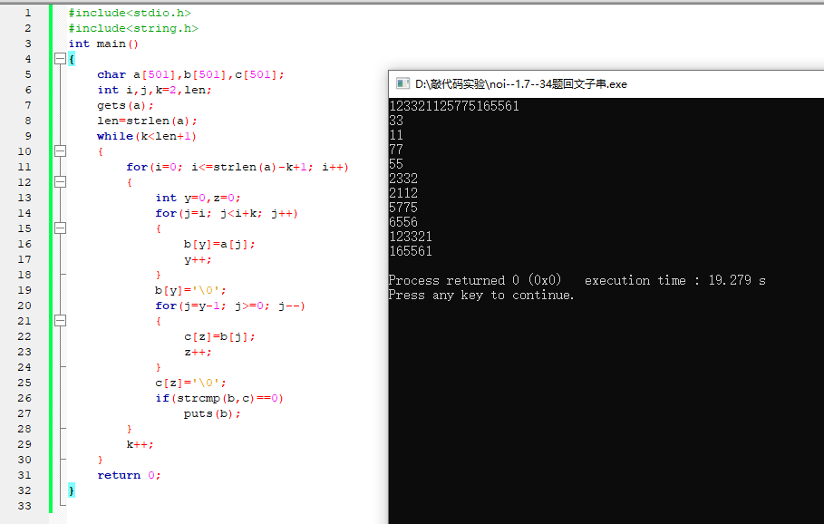 char a[501],b[501],c[501];//a[]为从键盘输入的数组,b[]存储顺序子串,c[]存储逆序的b[]子串