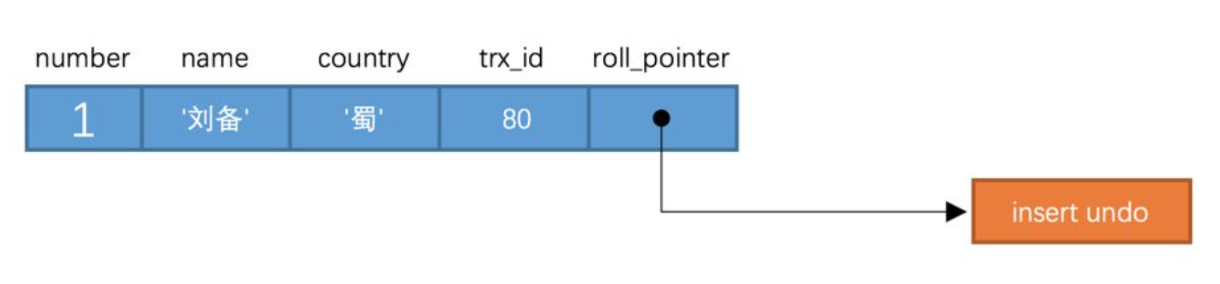 - roll_pointer :每次对某条聚簇索引记录进行改动时,都会把旧的版本写入到undo日志 中,然后这个隐藏列就相当于一个指针,可以通过它来找到该记录修改前的信息。