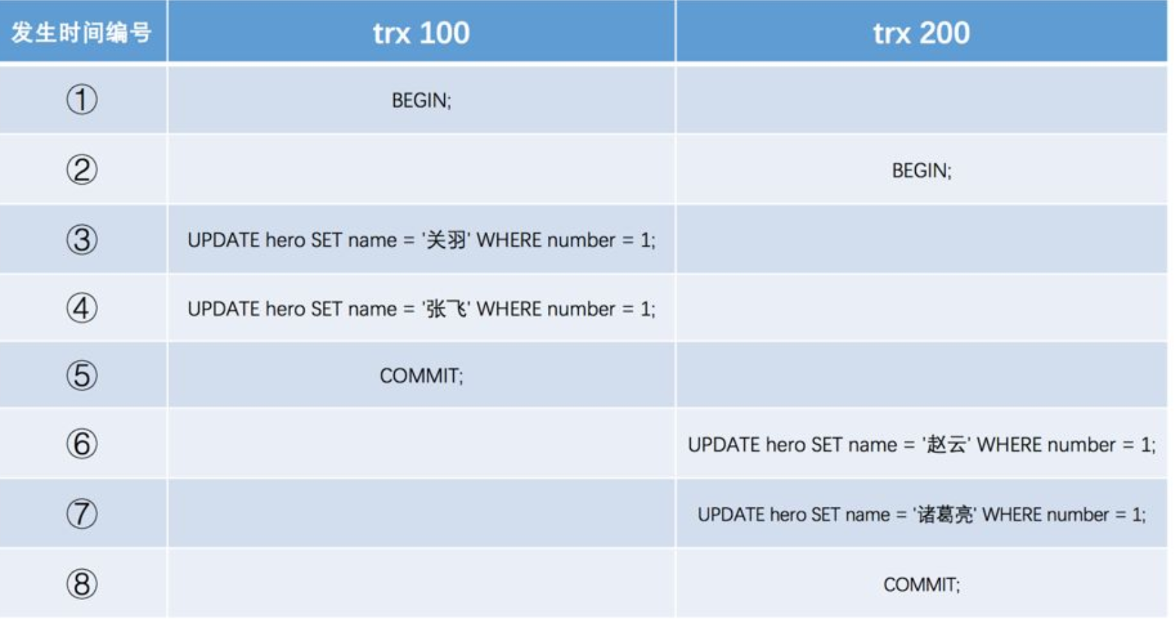 假设之后两个事务id 分别为100 、200 的事务对这条记录进行UPDATE 操作,操作流程如下: