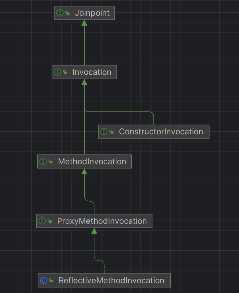 展示一下继承图,Spring使用的主要是ReflectiveMethodInvocation,这个对象里面的proceed方法会找到匹配当前方法的增强逻辑链,然后将链路上的增强逻辑都调用一遍,当然也会调用本方法执行逻辑